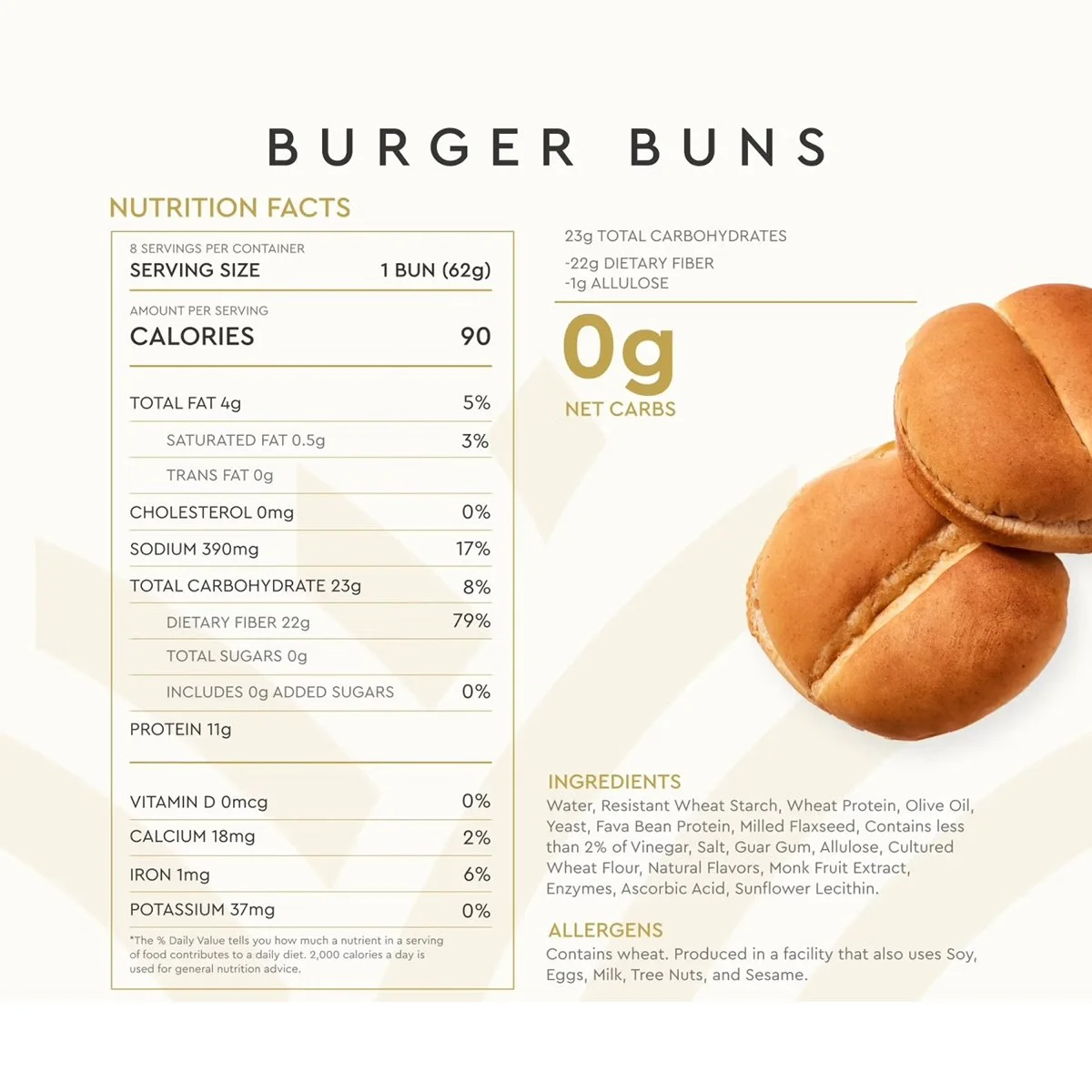 Ingredients: Water, resistant wheat starch, wheat protein, olive oil, yeast, fava bean protein, milled flaxseed, contains less than 2% of vinegar, salt, guar gum, allulose, cultured wheat flour, wheat flour, natural flavors, monk fruit extract, enzymes, ascorbic acid, sunflower lecithin. Contains: wheat