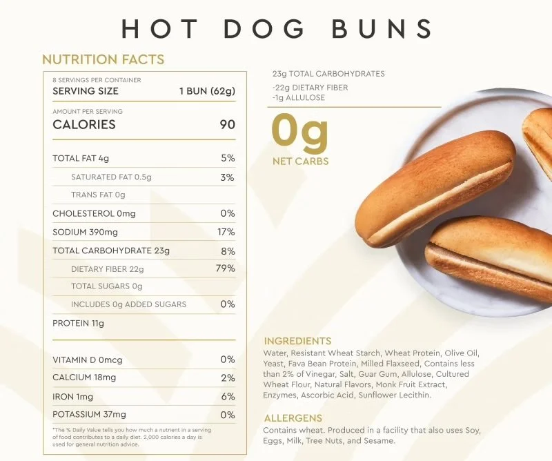 Ingredients: Water, resistant wheat starch, wheat protein, olive oil, yeast, fava bean protein, milled flaxseed, contains less than 2% of vinegar, salt, guar gum, allulose, cultured wheat flour, wheat flour, natural flavors, monk fruit extract, enzymes, ascorbic acid, sunflower lecithin. Contains: wheat